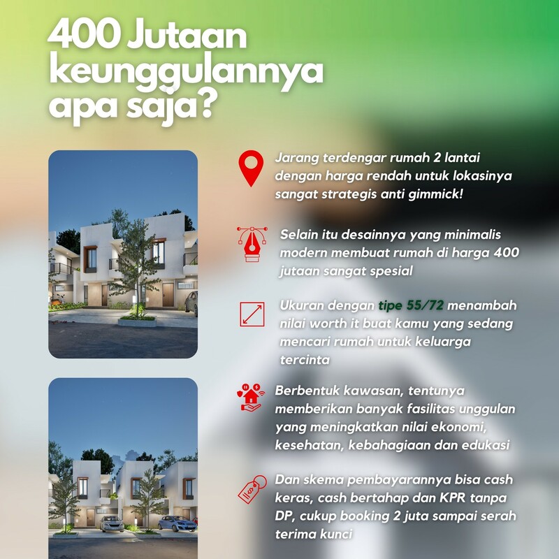 Dari rumah minimalis hingga hunian mewah, semua pilihan tersedia untuk memenuhi gaya hidup yang kamu inginkan. Lokasi strategis dengan akses mudah ke pusat kota, fasilitas umum, dan ruang hijau yang menenangkan akan membuatmu merasa selalu di rumah.